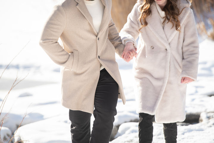 This winter engagement session at Bluffer's Park Beach captures the beauty of love amidst a serene, snowy landscape. The crisp white snow and the icy shoreline create a breathtaking contrast with the warmth shared by the couple. Wrapped in cozy coats, they walk hand in hand through the quiet winter scene, their connection radiating against the soft glow of the sun reflecting off the snow. Each photograph encapsulates the magic of this moment, where love thrives in the peaceful stillness of a winter wonderland.